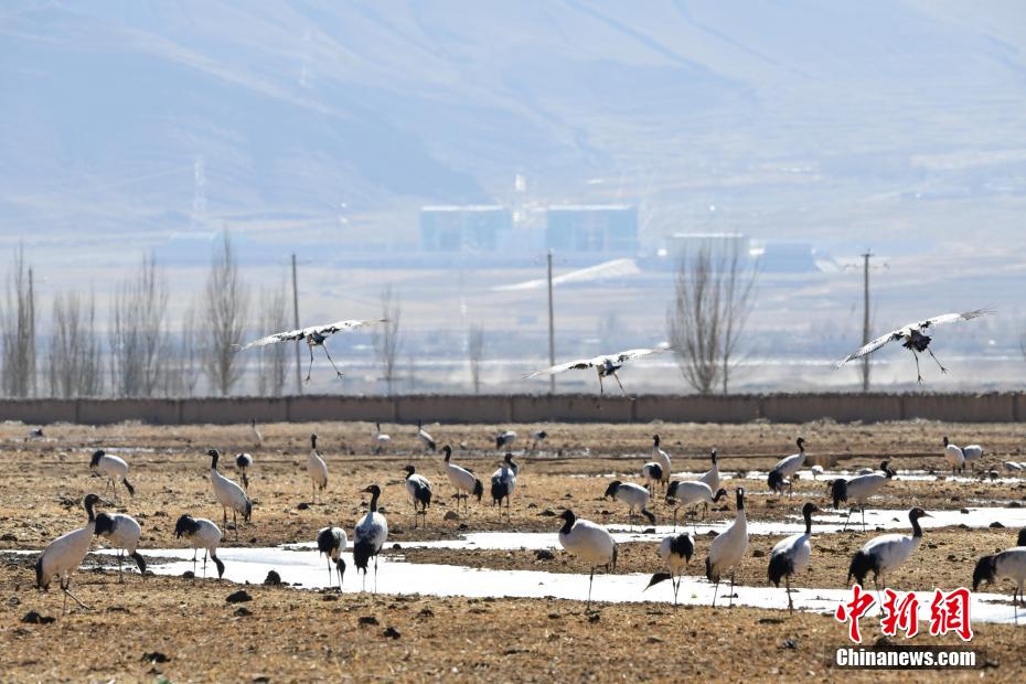 每年的10月底,成群的黑頸鶴飛到西藏拉薩市林周縣越冬,在拉薩市林周縣周邊的湖泊濕地度過5個月的“閑云野鶴”生活,次年三四月份再飛向藏北草原繁殖。黑頸鶴是世界上唯一一種高原鶴類。具有足長、喙長、頸長的典型涉禽類特征,適合在沼澤地里行走。黑頸鶴的頸、尾為黑色,體羽為灰白色。黑頸鶴是國家一級保護動物。目前,每年到林周縣越冬的黑頸鶴已達2000只左右。圖為黑頸鶴在林周境內的農田里覓食。 貢嘎來松 攝
