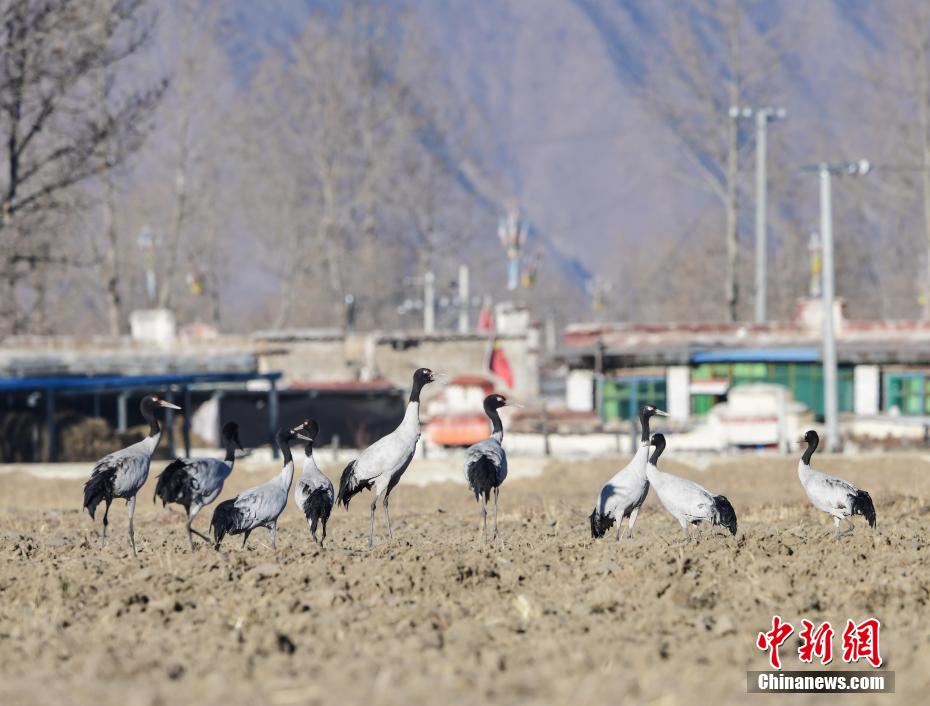 每年的10月底,成群的黑頸鶴飛到西藏拉薩市林周縣越冬,在拉薩市林周縣周邊的湖泊濕地度過5個月的“閑云野鶴”生活,次年三四月份再飛向藏北草原繁殖。黑頸鶴是世界上唯一一種高原鶴類。具有足長、喙長、頸長的典型涉禽類特征,適合在沼澤地里行走。黑頸鶴的頸、尾為黑色,體羽為灰白色。黑頸鶴是國家一級保護(hù)動物。目前,每年到林周縣越冬的黑頸鶴已達(dá)2000只左右。圖為黑頸鶴在林周境內(nèi)的農(nóng)田里覓食、嬉戲。 貢嘎來松 攝