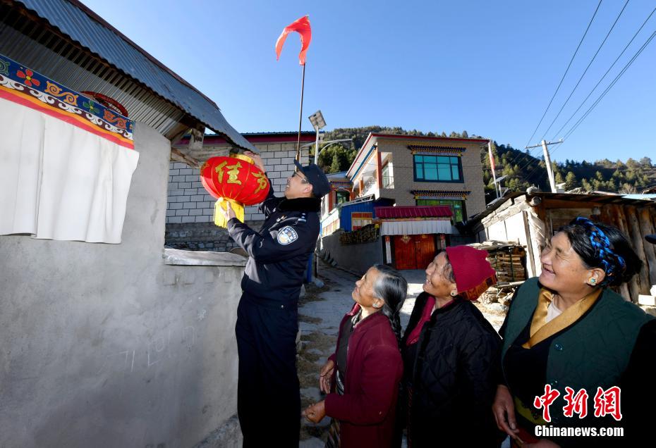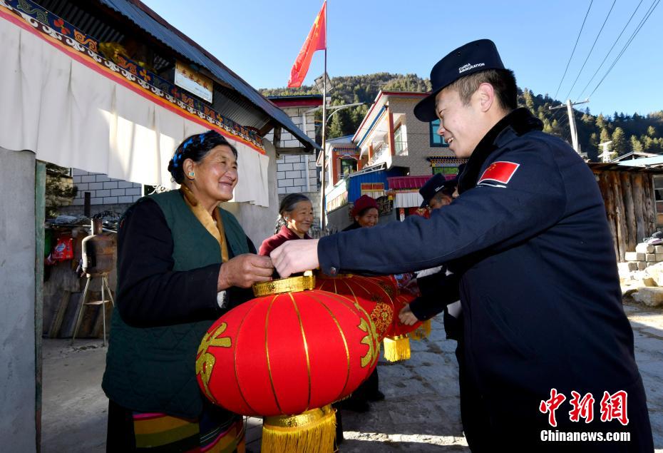 1月5日,西藏亞東出入境邊防檢查站移民警察為駐地3位藏族阿媽送去新春祝福及慰問品。西藏亞東邊檢站駐地亞東縣位于西藏自治區(qū)日喀則市東南部,與印度、不丹接壤,為西藏自治區(qū)邊境縣之一。圖為西藏亞東出入境邊防檢查站副站長馬巖(右二)為藏族老阿媽送上燈籠。 李林 攝