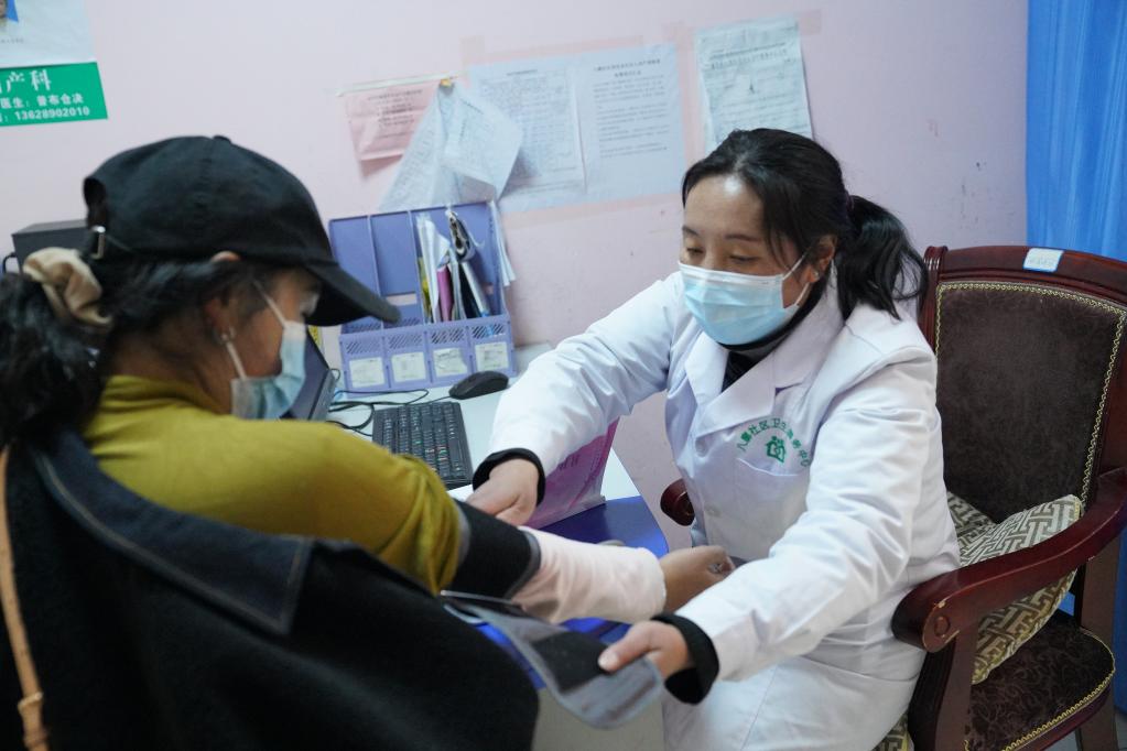 醫(yī)生為拉薩市八廓街道居民次仁卓瑪(右)測(cè)量血壓。新華社記者黃耀漫 攝