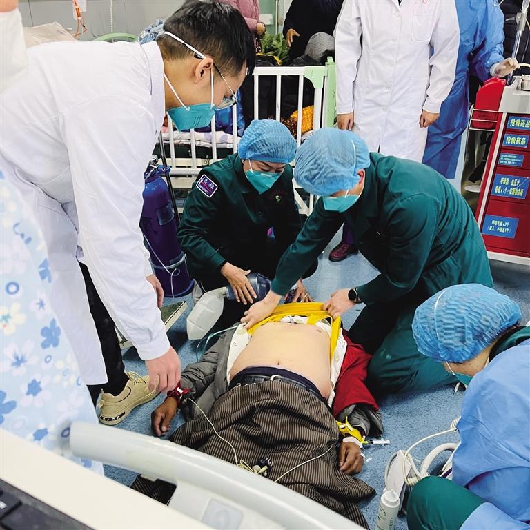 急診科值班醫(yī)生陳勝、副護(hù)士長(zhǎng)趙文熠等立即攜搶救車(chē)、除顫儀趕赴現(xiàn)場(chǎng),此時(shí),冬某意識(shí)喪失、頸動(dòng)脈搏動(dòng)消失、呼吸極其微弱。見(jiàn)患者病情危及生命,醫(yī)護(hù)人員立即實(shí)施搶救工作。急診醫(yī)護(hù)團(tuán)隊(duì)配合默契,胸外心臟按壓、球囊輔助通氣、建立靜脈通道、靜推腎上腺素、查心電圖、監(jiān)測(cè)生命體征、吸痰……一切有條不紊地進(jìn)行著。隨后,心電圖提示室顫,醫(yī)護(hù)人員立即予以非同步200J電除顫1次,待轉(zhuǎn)運(yùn)床到位后立即轉(zhuǎn)運(yùn)患者至搶救室進(jìn)一步救治,轉(zhuǎn)運(yùn)過(guò)程中心肺復(fù)蘇不間斷。
