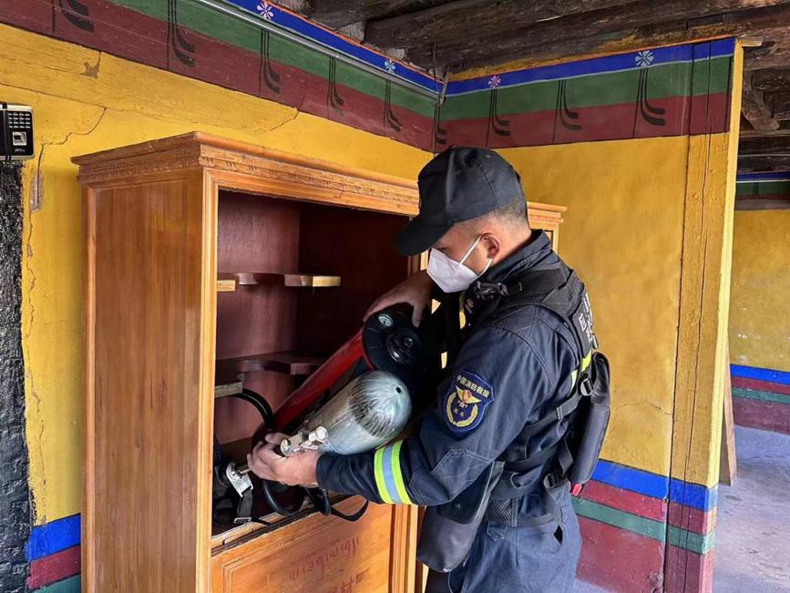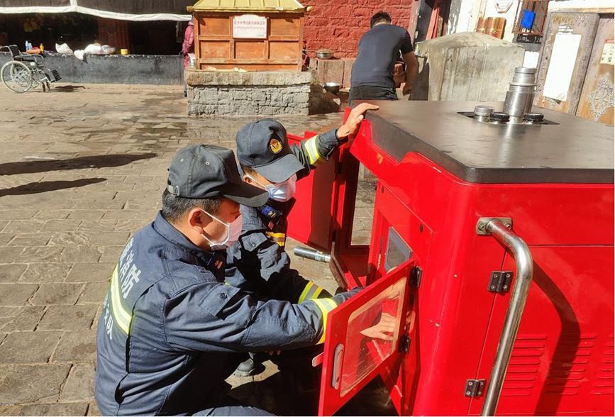 圖為檢查消防設(shè)備。圖片由布達拉宮消防救援大隊提供