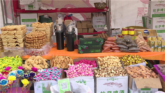 與往年一樣,酥油、卡賽、人參果等傳統(tǒng)食品和五彩青稞穗等仍是主角,來(lái)自新疆的果干、當(dāng)?shù)氐男迈r水果也同樣備受群眾喜愛(ài)。