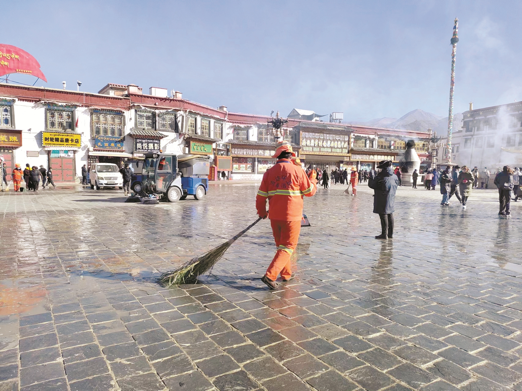 “今天,針對(duì)大昭寺廣場(chǎng)衛(wèi)生整治,我們一共出動(dòng)了20余名保潔人員,還有一臺(tái)小高壓沖洗車和兩臺(tái)小型機(jī)掃車。通過(guò)人機(jī)結(jié)合的方式,對(duì)廣場(chǎng)進(jìn)行徹底的衛(wèi)生大掃除,希望在藏歷新年期間,為市民營(yíng)造一個(gè)良好的衛(wèi)生環(huán)境。”西藏博瑞環(huán)衛(wèi)服務(wù)有限公司督察員強(qiáng)巴偉色介紹說(shuō)。