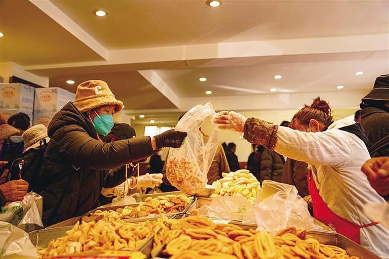 不遠(yuǎn)處,尼珍藏式卡塞店的店員們正忙著制作“卡塞”,揉面、切割、染色,面片經(jīng)店員們的巧手捏成長(zhǎng)條形、圓形、蝴蝶形等不同樣式,最后放到油鍋炸至金黃,出鍋后瀝油再撒上白糖,香甜可口、樣式精美的卡塞就制作完成了。新鮮出爐的卡塞顏色金黃、香氣四散開來,市民們爭(zhēng)相選購(gòu)?!拔覀冏隹ㄈ呀?jīng)25年了,今年1月10日開門營(yíng)業(yè),很多老顧客就來光顧了,每天收入在2000元至3000元之間,而且我們選用的原材料比較好,再加上現(xiàn)場(chǎng)制作、新鮮銷售,生意好的時(shí)候賣得更多?!崩习迥嵴涓嬖V記者:“我們店制作的卡塞價(jià)格實(shí)惠,連續(xù)8年沒有漲價(jià),每斤30元,今年準(zhǔn)備營(yíng)業(yè)到藏歷十二月二十九(公歷2月19日)歇業(yè)。”