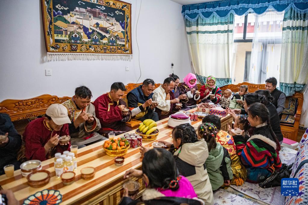 在位于森布日安置點(diǎn)的家中,石秀次仁(左)和家人一起吃“古突”(2月19日攝)。