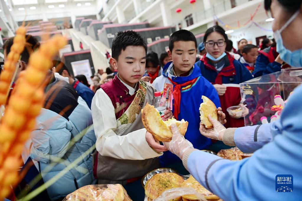 2月21日,在西安市浐灞第一中學舉行的藏歷新年團拜活動上,學生品嘗特色小吃。新華社記者 李一博 攝