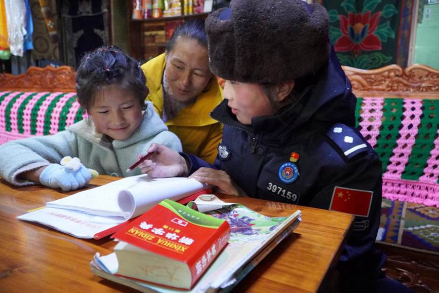 為孩子輔導(dǎo)作業(yè)。圖片由玉麥鄉(xiāng)邊境派出所提供