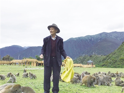 在多布杰看來,猴群也是一個(gè)小社會,母子情深、朋友互助、爭斗打架都有。在上千只猴子中,多布杰只給一只臉特別紅的小猴子取了個(gè)名字——“瑪惹”,漢語意思是“小紅”。因?yàn)槌錾蠛飲寢寷]有奶水,它餓得嗷嗷直叫,多布杰只得將它帶回家中照料。那時(shí),他的孫女也特別喜歡這只小猴子,每天放學(xué)回家就會給它喂吃的。幾天后,孫女翻遍了每個(gè)角落都沒有找到“瑪惹”,急得嚎啕大哭。多布杰耐心地說,我們和“瑪惹”是好朋友,帶它回來是為了讓它活下去,但它終歸是要回到猴群中,回到猴媽媽身邊?!艾斎恰遍L大后,也時(shí)常會找多布杰蹭衣撒嬌。