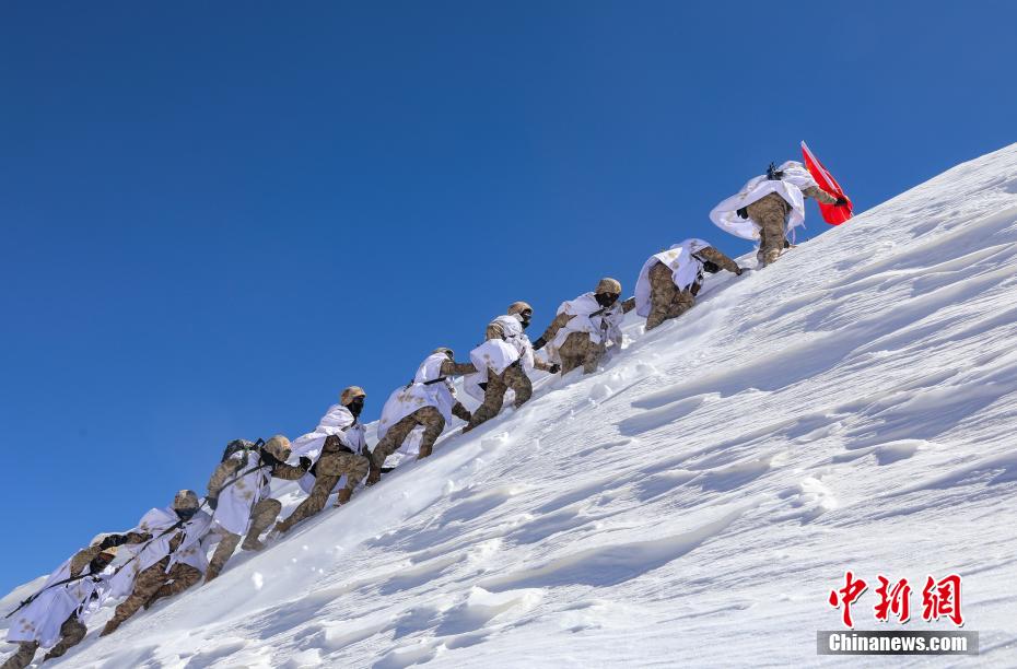 3月21日,阿里軍分區(qū)某邊防團(tuán)巡邏官兵翻越冰雪達(dá)坂向點(diǎn)位前行。李海亮 攝