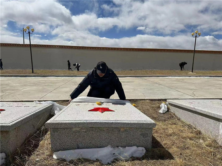 雪山巍峨,藍天廣闊,白云朵朵,那曲烈士陵園整潔安寧,革命烈士紀念碑莊嚴肅穆?;顒又?,駐村工作隊隊長和村黨員干部、各族群眾一起列隊整齊,向那曲革命烈士紀念碑敬獻花圈,全體人員在革命烈士紀念碑前肅立、默哀,寄托對烈士的緬懷與哀思。隨后全體人員懷著對革命先烈的崇敬心情祭掃烈士墓,在烈士墓碑前一一敬獻上鮮花和哈達,聆聽著革命先烈為解放那曲各族群眾而壯烈犧牲的可歌可泣的英雄故事,眼神中流露出無限的緬懷之情。瞻仰結(jié)束后,村黨員干部和各族群眾還來到烈士紀念館參觀,在紀念館副站長次塔卓瑪?shù)纳钋橹v解中全面了解了西藏和平解放的歷史,深入體會了在那曲革命建設(shè)中無數(shù)共產(chǎn)黨員、革命先烈前赴后繼、奉獻高原的崇高精神。