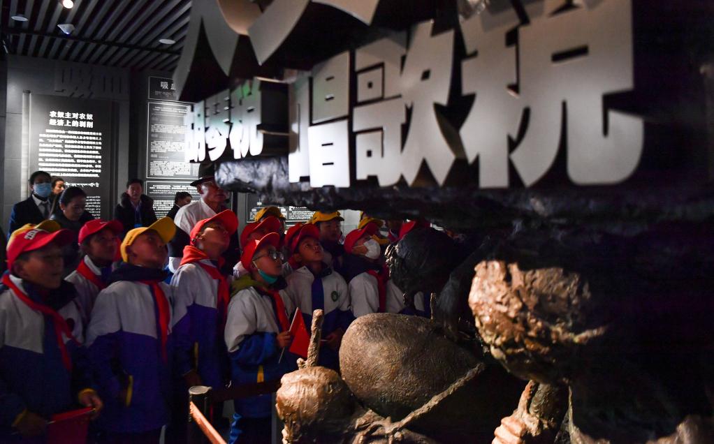 與此同時(shí),西藏百萬農(nóng)奴解放紀(jì)念館也迎來了不少市民、中小學(xué)生和游客。這座占地2700平方米的展館里,陳列著反映舊西藏苛捐雜稅的雕像,再現(xiàn)舊西藏農(nóng)奴被囚禁虐待的情景。