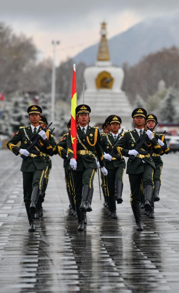 國旗護(hù)衛(wèi)隊(duì)邁著整齊劃一的步伐,把五星紅旗送到廣場升旗處(3月28日攝)。新華社記者晉美多吉 攝