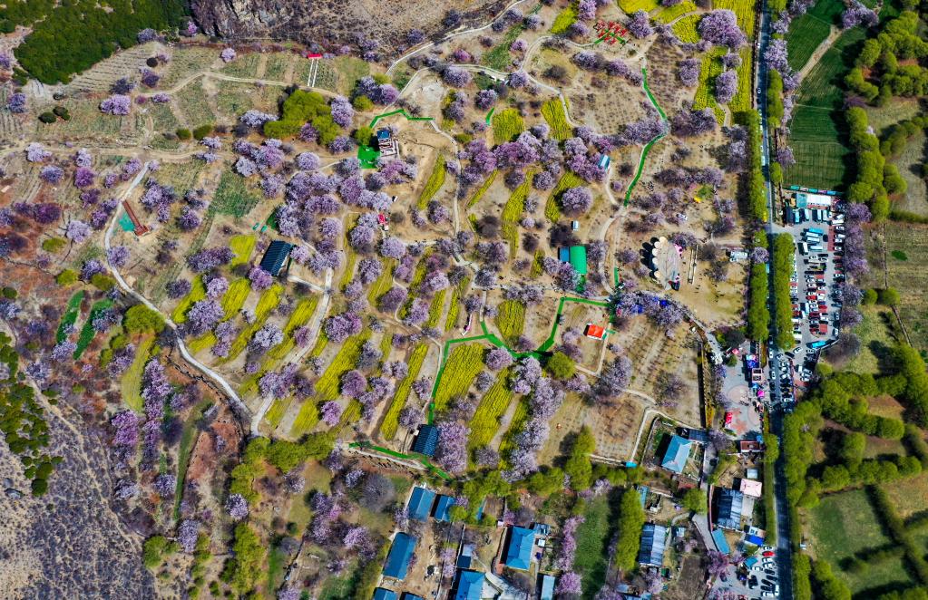 鳥瞰桃花盛開的嘎拉村,停滿了旅游車輛(無人機(jī)照片,3月24日攝)。新華社記者 姜帆 攝