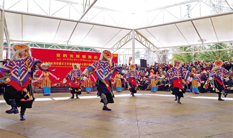 圖為拉薩市熱烈慶祝西藏百萬(wàn)農(nóng)奴解放紀(jì)念日暨行政村文藝演出隊(duì)文藝展演現(xiàn)場(chǎng)。 記者 丹增群培 攝