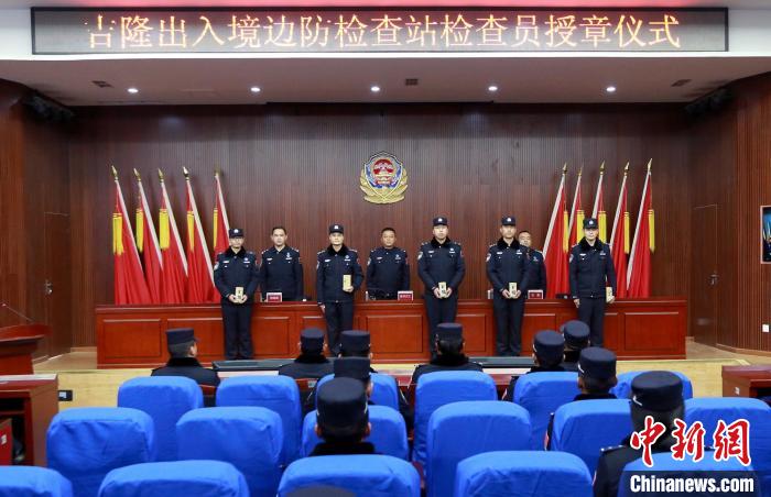 3月31日,邊檢站領(lǐng)導(dǎo)通過授章考核的移民管理警察授章?!⌒じ毁F 攝