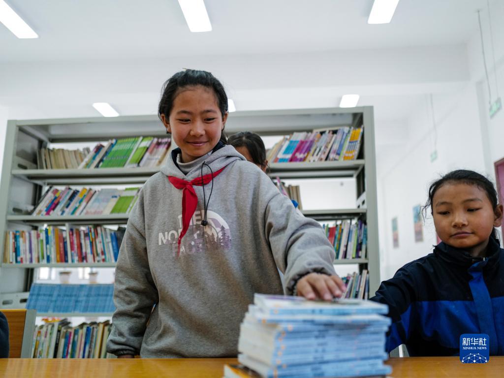 3月31日,學(xué)生們正在向教室的圖書角搬運(yùn)新圖書。新華社記者 洛卓嘉措 攝