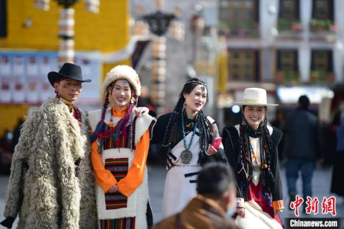 西藏拉薩,身著藏族傳統(tǒng)服飾的游客在八廓街拍照留念。貢嘎來松 攝