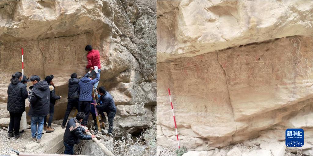(左)工作人員正在對(duì)查果西溝B點(diǎn)摩崖石刻造像進(jìn)行調(diào)查記錄,(右)該摩崖石刻造像現(xiàn)狀。(資料圖片由西藏自治區(qū)文物保護(hù)研究所提供)