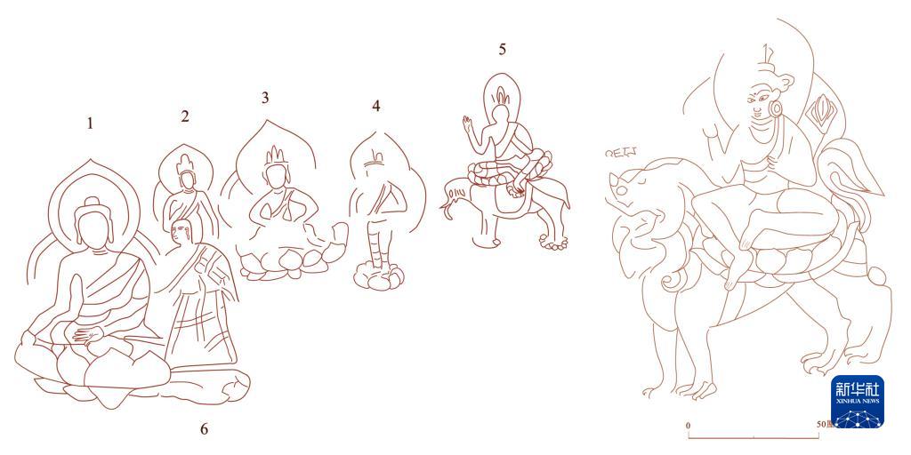 ?。ㄗ螅┎楣鳒螧點(diǎn)摩崖石刻造像分布示意圖,(右)然堆村騎獅文殊像。(摩崖石刻局部線圖由西藏自治區(qū)文物研究所提供)