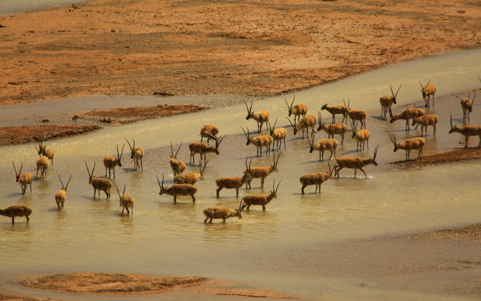 部分雄性藏羚在羌塘國(guó)家公園候選區(qū)江俄藏布泡澡 (羌塘國(guó)家級(jí)自然保護(hù)區(qū)管理局供圖)