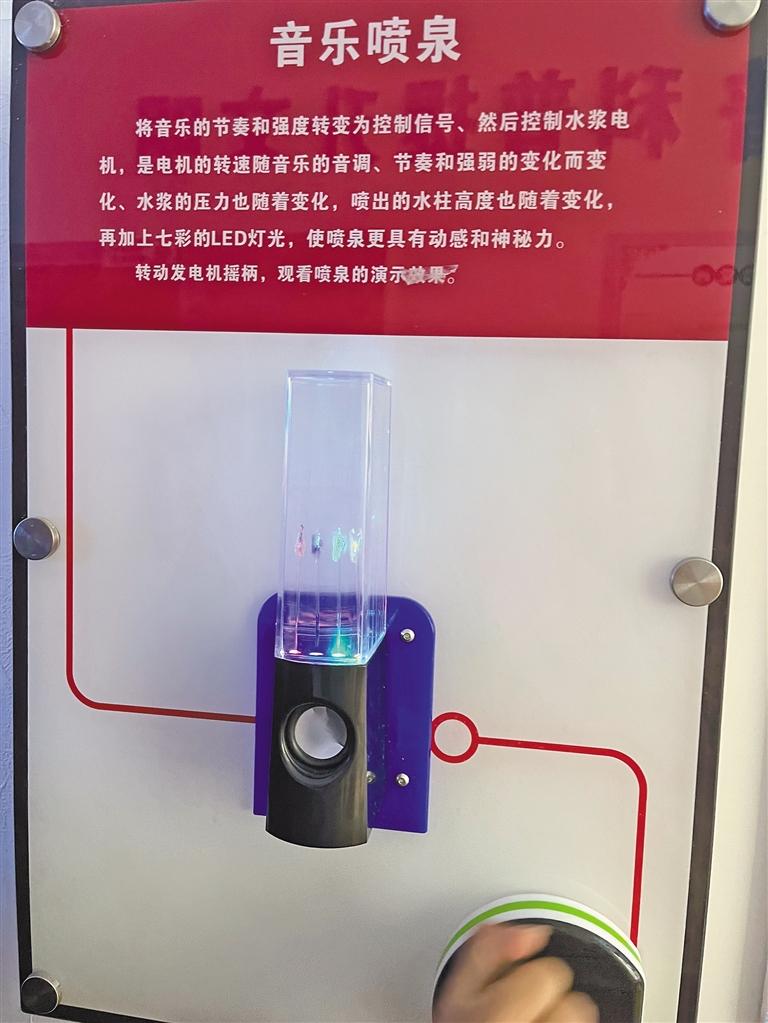 “這個(gè)體驗(yàn)項(xiàng)目叫‘天上來(lái)水’。設(shè)計(jì)者巧妙設(shè)計(jì)水流通過(guò)水泵及透明玻璃管壓入水龍頭內(nèi),在封閉的水龍頭出口處將水溢出管口,溢出的水又將玻璃管隱蔽,水流的循環(huán)造成觀眾難以發(fā)現(xiàn)特殊裝置的奧秘,從而形成人為制造的錯(cuò)覺(jué)。”體驗(yàn)結(jié)束后,索央向小朋友解釋“天上來(lái)水”的科學(xué)原理。