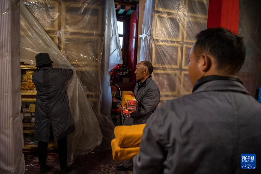 久米次成(左)與同事搬運準備進行普查登記的古籍(4月19日攝)。新華社記者 晉美多吉 攝