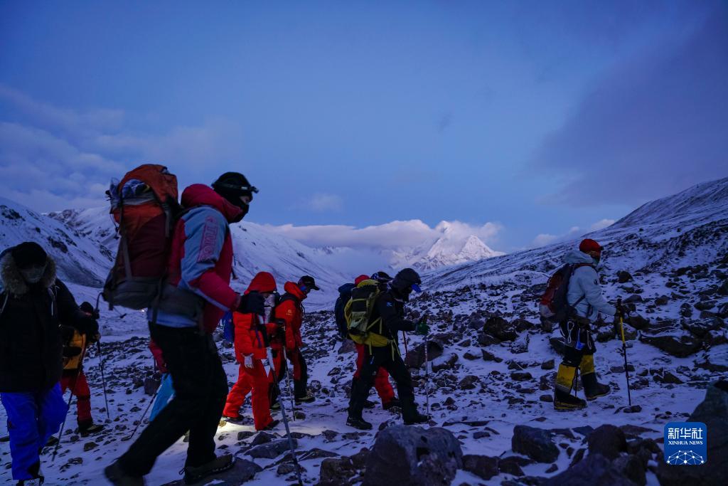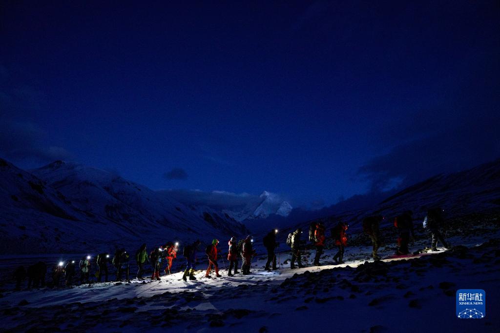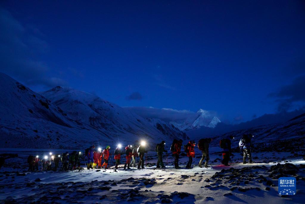 5月3日,登山愛好者在凌晨出發(fā),開始攀登海拔6010米的洛堆峰。新華社記者 孫非 攝