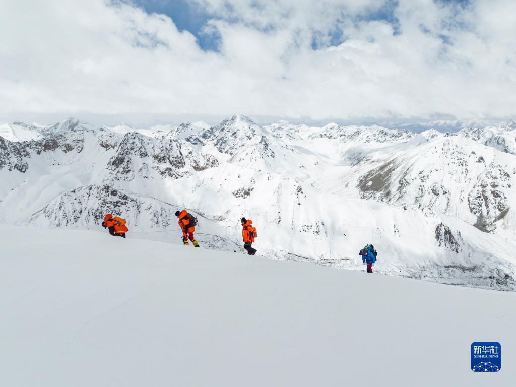 5月3日,登山愛好者正在攀登海拔6010米的洛堆峰(無人機照片)。新華社記者 孫非 攝
