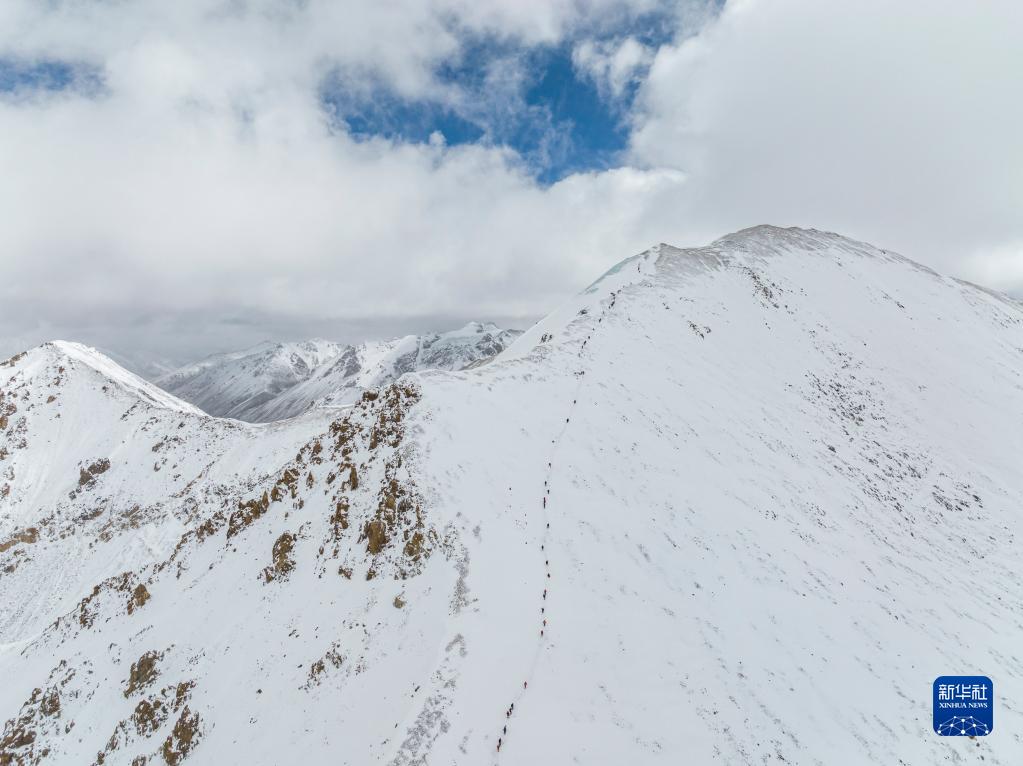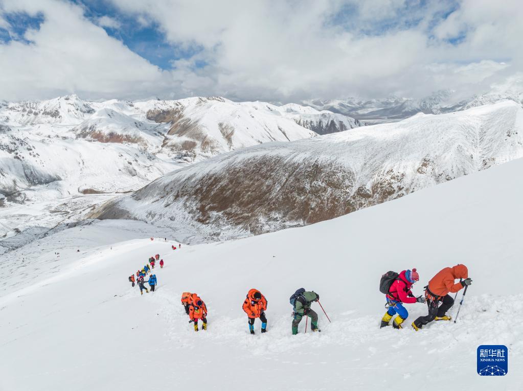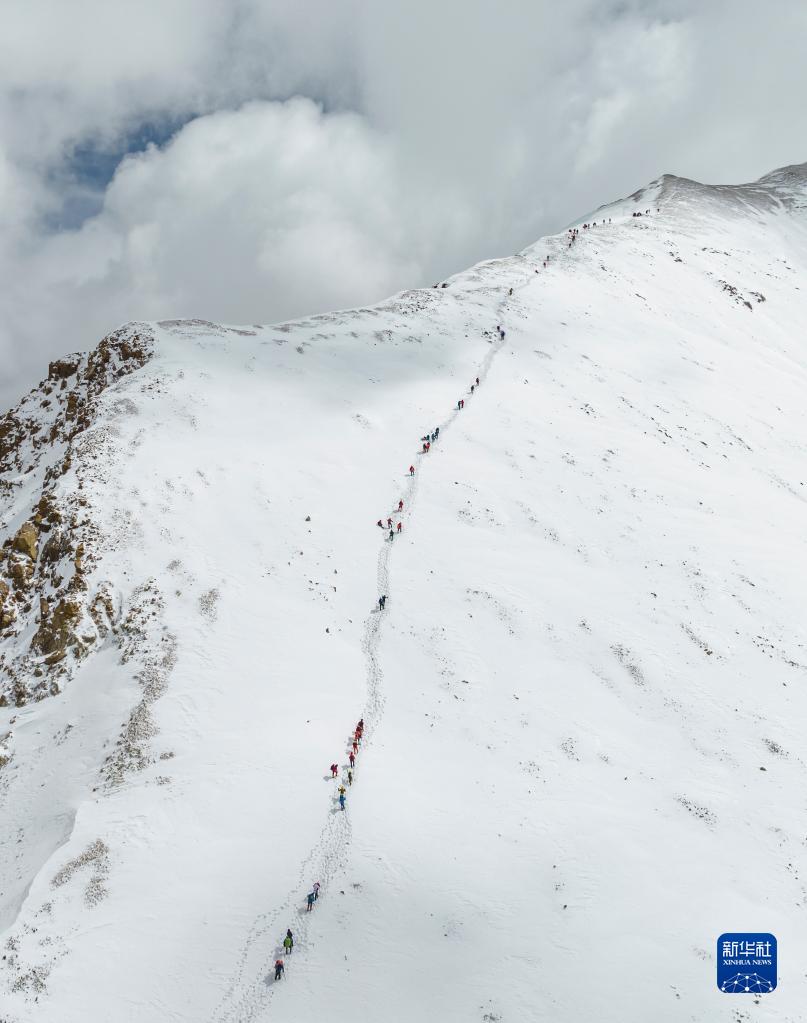 5月3日,登山愛好者正在向海拔6010米的洛堆峰峰頂進發(fā)(無人機照片)。新華社記者 孫非 攝