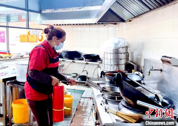 模擬廚房發(fā)生火災,員工發(fā)現(xiàn)火源后,立即關閉燃氣閥,拉閘斷電,第一時間利用周邊滅火器進行初期火災撲救?!㈣?攝