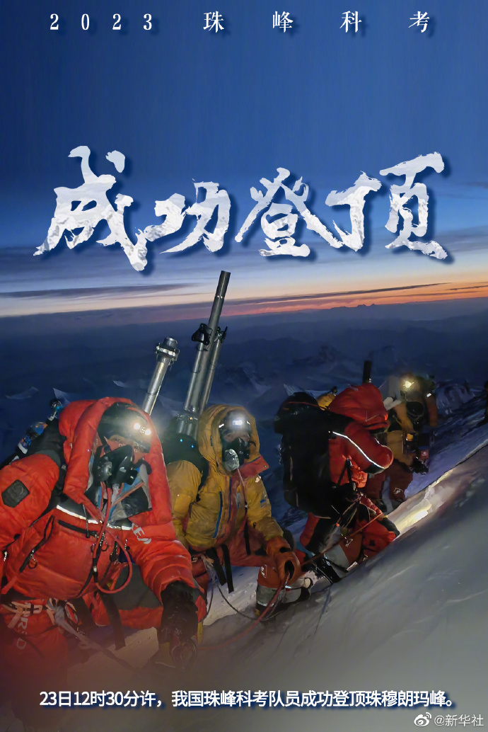 23日12時30分許,2023年珠峰科考13名登頂隊員成功登頂?shù)厍蛑畮p珠穆朗瑪峰。之后,他們將完成峰頂雪冰樣品采集等重要科考任務(wù)。