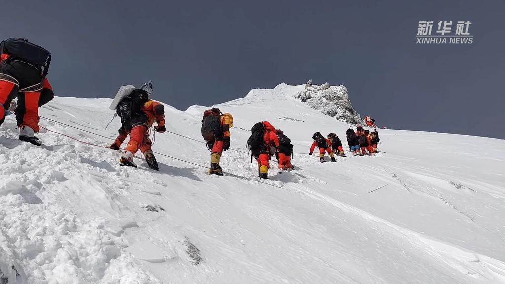 這是我國珠峰科考繼2022年之后,再次突破8000米以上海拔高度。當日,科考隊員在珠峰峰頂利用科學儀器,采集珠峰峰頂?shù)难┍鶚悠?,用于分析氣候環(huán)境指標。