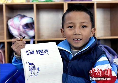 2023年3月,西藏拉薩市第一小學(xué)一年級六班學(xué)生吉美旺堆展示自己書寫的藏文。李林 攝