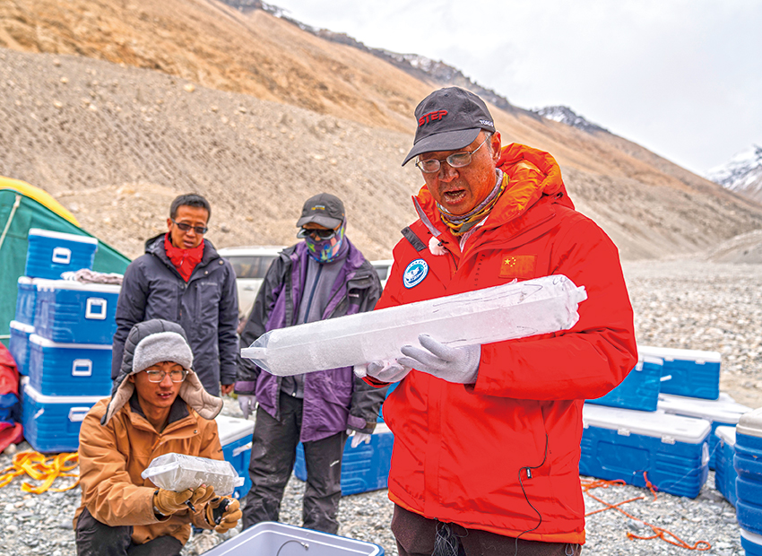 在珠峰登山大本營,中國科學院西北生態(tài)環(huán)境資源研究院副院長康世昌(右)在查看從珠峰海拔約6500米處鉆取的冰芯樣品(5月22日攝)。新華社記者孫非攝