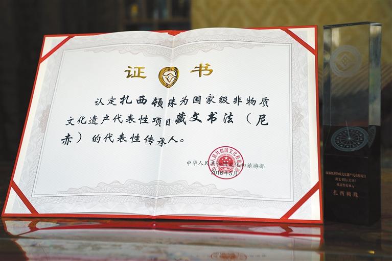 2018年,扎西頓珠被評為國家級非物質(zhì)文化遺產(chǎn)代表性項目藏文書法(尼赤)的代表性傳承人。