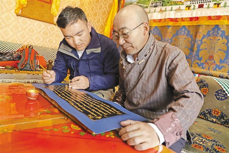 扎西頓珠和徒弟洛桑在藍(lán)青紙上抄寫藏文文獻(xiàn)。