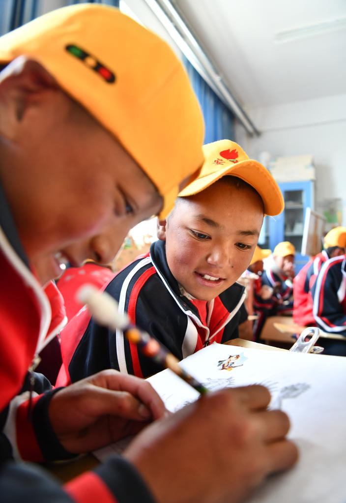 6月5日,扎西宗鄉(xiāng)完全小學(xué)的學(xué)生在上美術(shù)課。新華社記者 費(fèi)茂華 攝