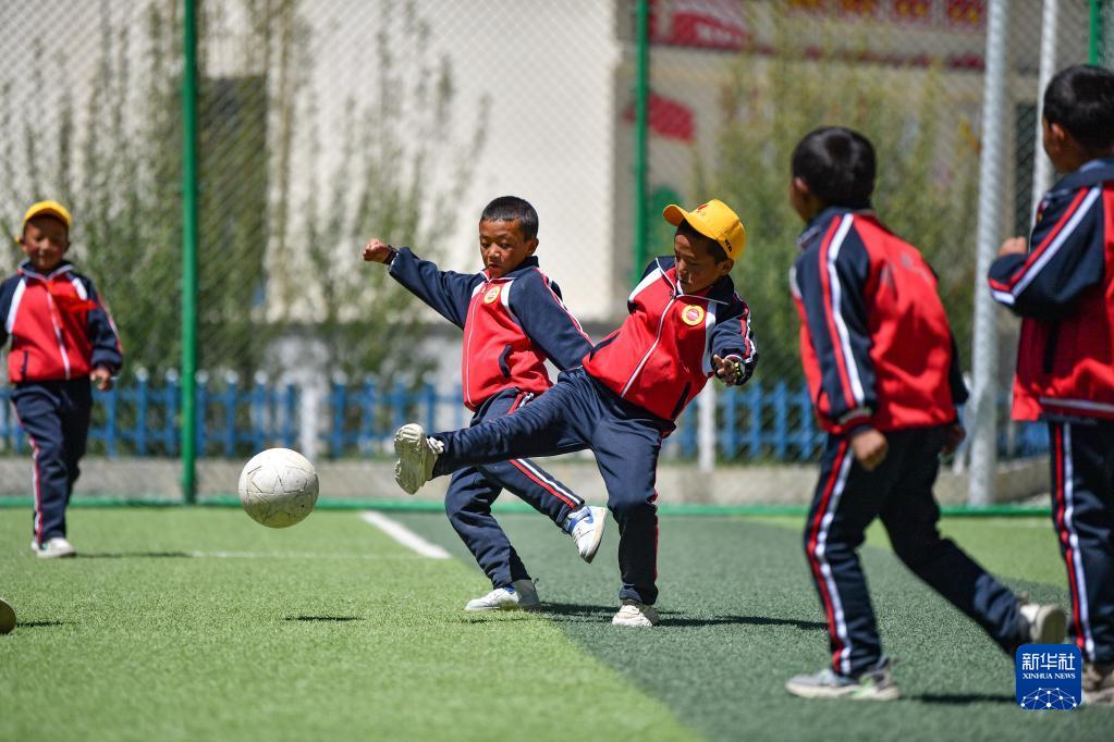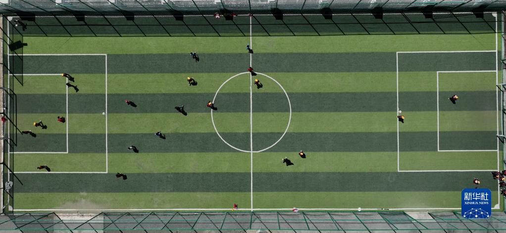 扎西宗鄉(xiāng)完全小學(xué)的學(xué)生在體育課上踢足球(6月5日攝,無人機(jī)照片)。新華社記者 晉美多吉 攝