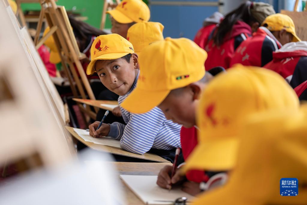 6月5日,阿旺尼曲(左一)在上美術(shù)課。新華社記者 費(fèi)茂華 攝