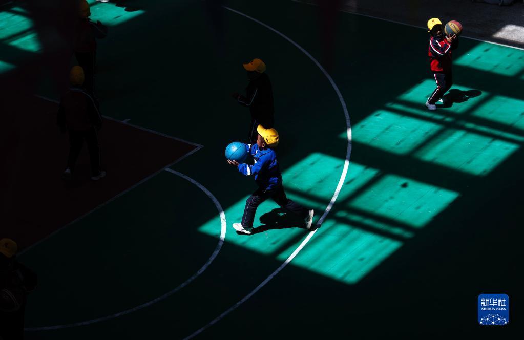 6月5日,扎西宗鄉(xiāng)完全小學(xué)的學(xué)生在室內(nèi)體育館上籃球課。新華社記者 費(fèi)茂華 攝