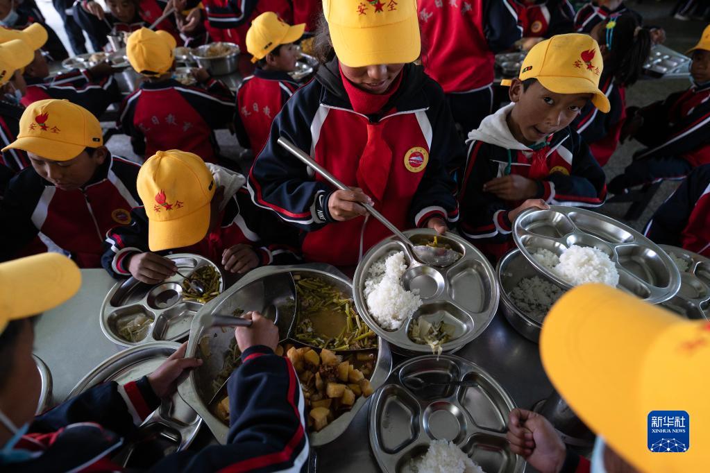 6月5日,扎西宗鄉(xiāng)完全小學(xué)的學(xué)生在食堂吃午飯。新華社記者 費(fèi)茂華 攝