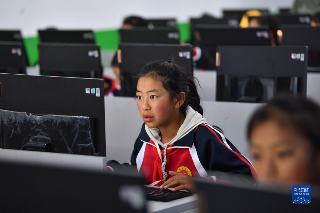 扎西宗鄉(xiāng)完全小學(xué)的學(xué)生在上計(jì)算機(jī)課(6月5日攝)。新華社記者 晉美多吉 攝