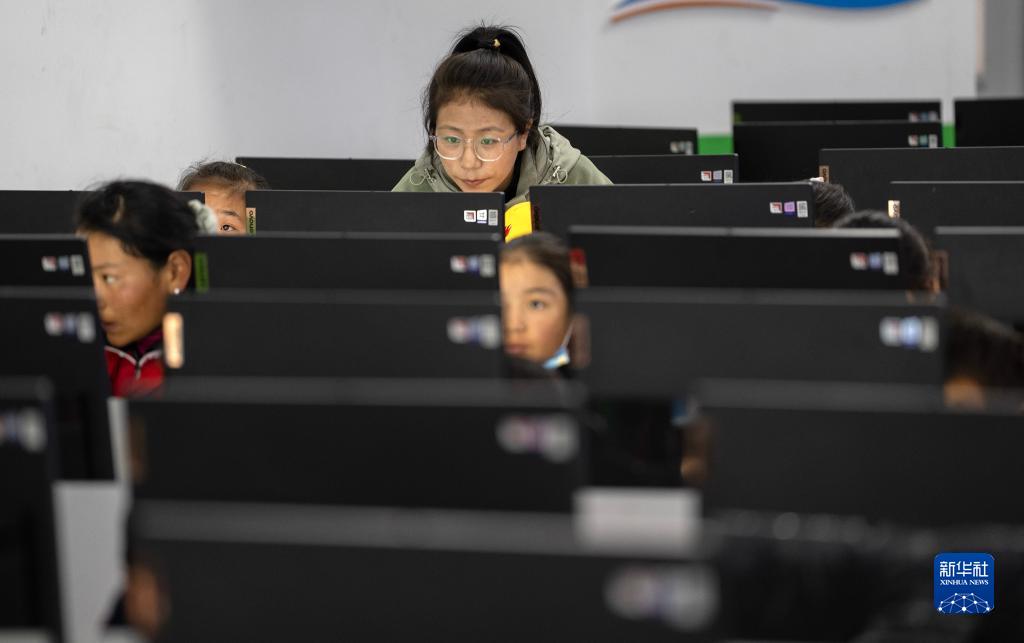 6月5日,拉巴卓瑪老師在給扎西宗鄉(xiāng)完全小學(xué)六年級的學(xué)生上計(jì)算機(jī)課。新華社記者 費(fèi)茂華 攝