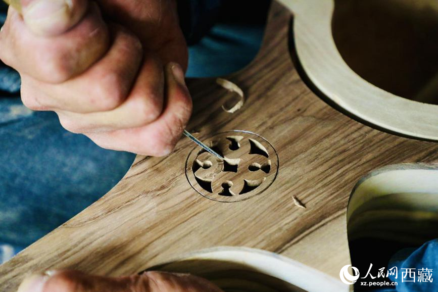 娘嘎扎念琴制作技藝傳承人羅布次旦在制作扎念琴。人民網(wǎng)記者 次仁羅布攝