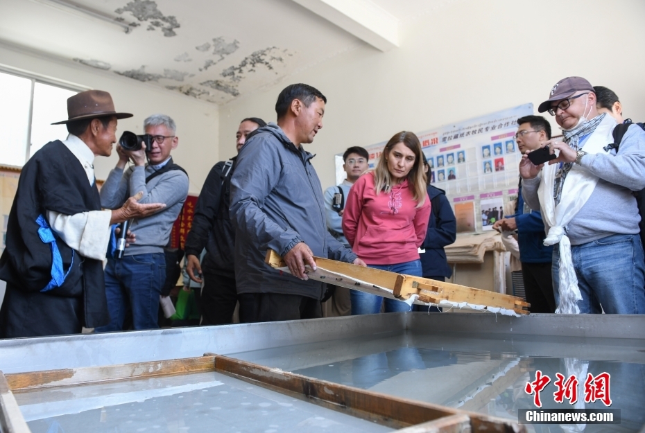 6月15日,西藏拉薩,記者們在尼木縣非遺工坊(藏紙制作廠)采訪了解藏紙。在第五屆中國西藏旅游文化國際博覽會召開之際,國務(wù)院新聞辦組織中外媒體記者赴西藏采訪,路透社、共同社、西班牙埃菲社、意大利安莎社、新加坡《聯(lián)合早報》和中央廣電總臺、中國日報等15家媒體的20名記者參加。6月15日,采訪團(tuán)一行前往拉薩市尼木縣參訪體驗(yàn)西藏傳統(tǒng)藏香、藏紙文化。