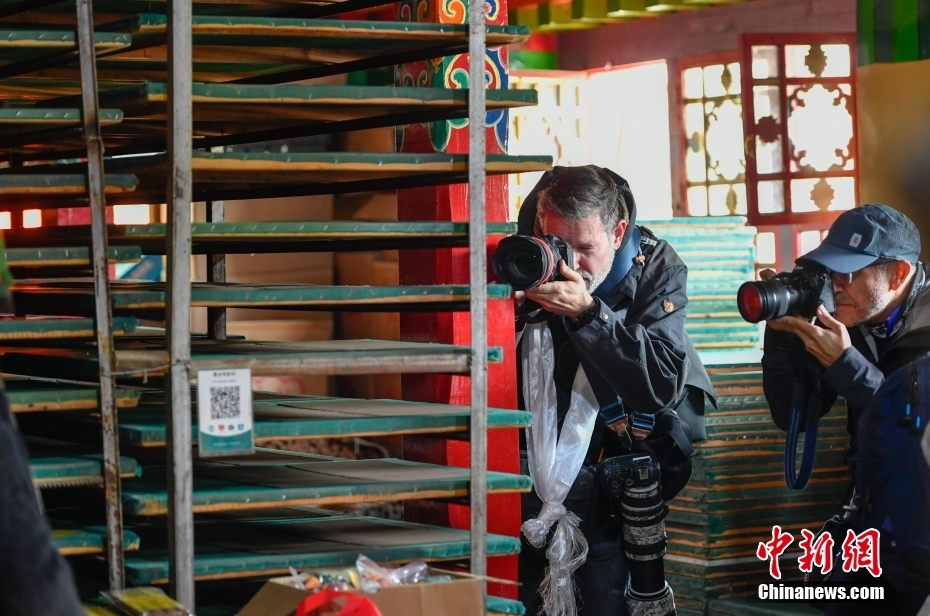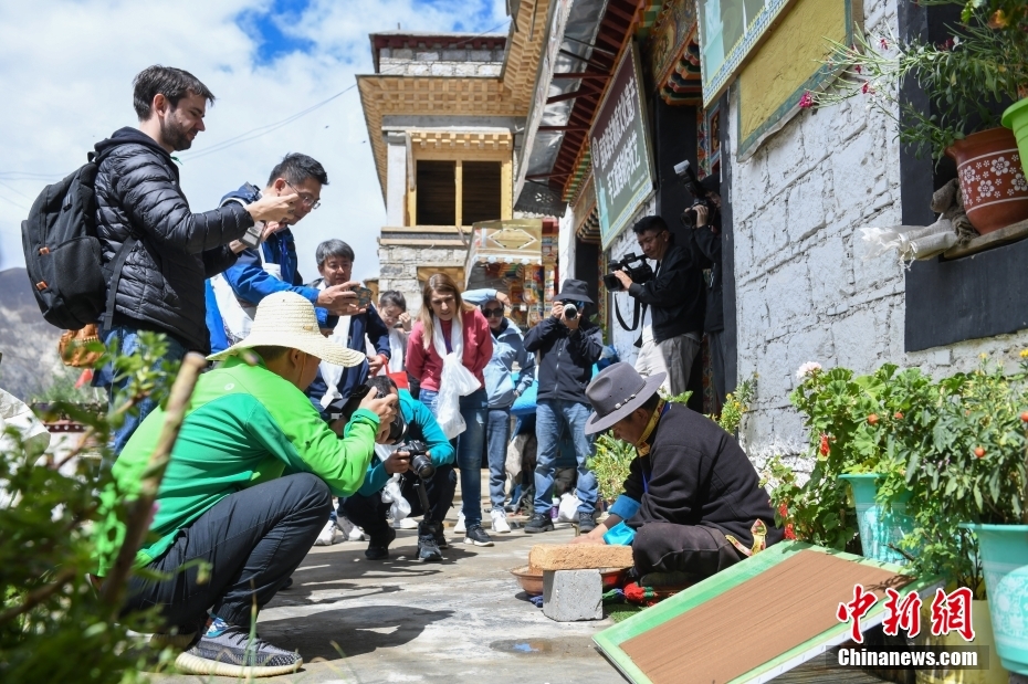 6月15日,西藏拉薩,記者們在尼木縣非遺工坊(藏紙制作廠)采訪拍攝。在第五屆中國西藏旅游文化國際博覽會召開之際,國務(wù)院新聞辦組織中外媒體記者赴西藏采訪,路透社、共同社、西班牙埃菲社、意大利安莎社、新加坡《聯(lián)合早報》和中央廣電總臺、中國日報等15家媒體的20名記者參加。6月15日,采訪團(tuán)一行前往拉薩市尼木縣參訪體驗(yàn)西藏傳統(tǒng)藏香、藏紙文化。