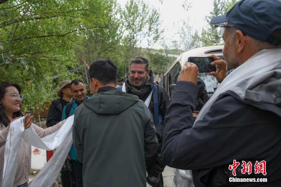 6月15日,西藏拉薩,尼木縣吞巴鎮(zhèn)吞達(dá)村村民給來訪記者們敬獻(xiàn)哈達(dá),表示歡迎。在第五屆中國西藏旅游文化國際博覽會召開之際,國務(wù)院新聞辦組織中外媒體記者赴西藏采訪,路透社、共同社、西班牙埃菲社、意大利安莎社、新加坡《聯(lián)合早報》和中央廣電總臺、中國日報等15家媒體的20名記者參加。6月15日,采訪團(tuán)一行前往拉薩市尼木縣參訪體驗(yàn)西藏傳統(tǒng)藏香、藏紙文化。