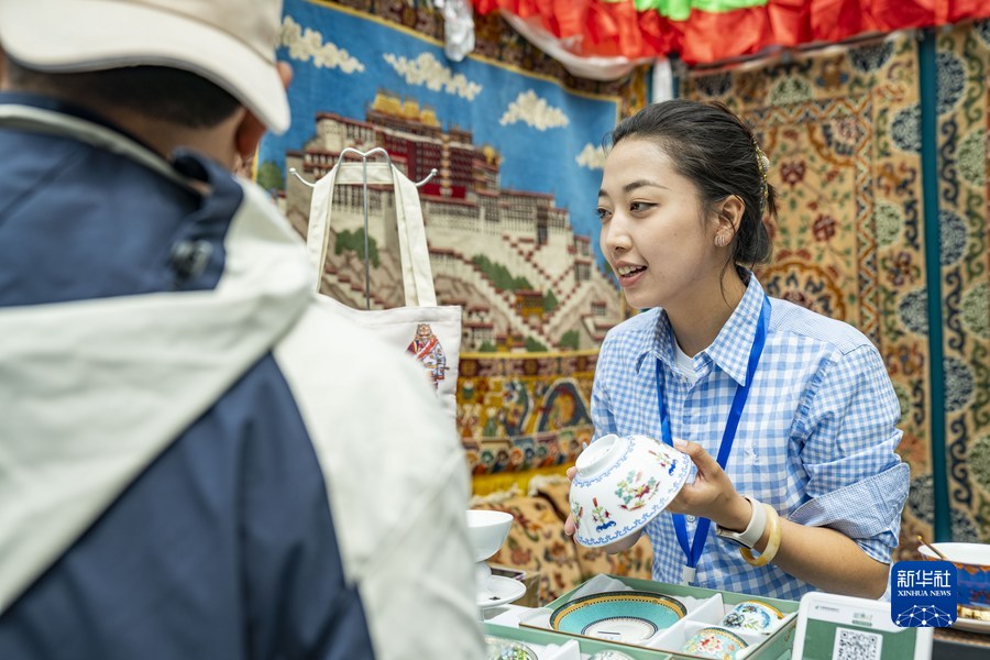 在第五屆“藏博會(huì)”現(xiàn)場,工作人員向顧客介紹產(chǎn)品(6月18日攝)。新華社記者 孫非 攝