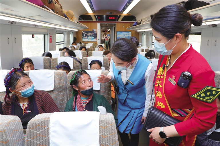 2022年初,青藏集團有限公司在管內(nèi)各站、車開展“天路格桑花”品牌創(chuàng)建以來,拉林鐵路各車站、各次列車上都能看到“天路格?;ā狈?wù)隊員,他們用真誠、熱情、熱心為每一位旅客提供溫馨細致的服務(wù)?!?月初,我?guī)е⒆觼砦鞑芈糜危?月20日前往林芝,游玩了三天,由于家里有事,不得不趕回去,就買了今天中午回拉薩的火車票,剛開車不久我姑娘就發(fā)燒,肚子痛。列車員看見孩子難受就詢問情況,并找來列車長周晶,通過廣播為我們找醫(yī)生,還好沒啥大事,就是腸胃感冒,我也就放心了。周晶車長也一直在旁邊幫我照顧孩子,拿濕毛巾擦臉,蓋毛毯,送來熱水,太細心了,讓我很感動。她們工作認真負責(zé),服務(wù)周到,我一路上都親身感受到了高原動車的熱情?!痹?4日林芝到拉薩的C926次列車上,來自四川的高雅女士拉著記者激動地說。